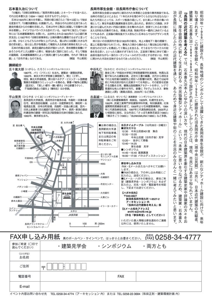 そこで僕がいつもお世話になっている建築と都市を考える会が主催し、この建物を設計した建築家・石本喜久治さん(Wikipedia)にスポットを当て、彼が長岡に残した近代建築を通して身近な建築や街を考えてみよう!、という趣旨でシンポジウムが開催されることになりました。